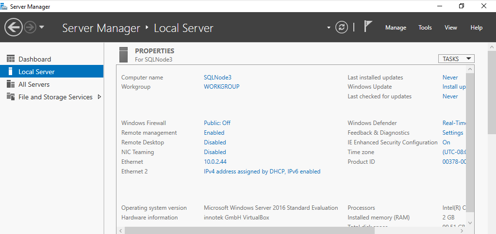 Build a new virtual machine in the Oracle VirtualBox. Its configurations should be similar to existing cluster nodes SQLNode1 and SQLNode2. You can follow this article, A comprehensive guide to SQL Server Always On Availability Groups on Windows Server 2016 for reference purposes.