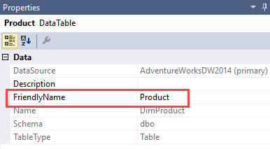 Finally, assign user friendly names to the tables. This might seem unnecessary since users don’t see the DSV directly. However, any dimension or measure group is created from a table in the DSV. If they already have decent names, you won’t need to rename them during the creation process. If you forget to change the name of such an object, you can still do it after the creation, but this means the ID of the object (which doesn’t change) and the actual name will differ. This can be annoying when scripting out certain aspects of the cube using XMLA. You can find the FriendlyName property in the properties window of a table in the DSV: