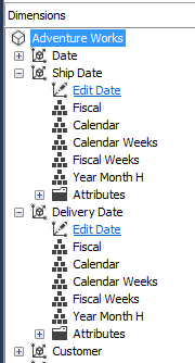 - My personal preference is to have distinct dimensions instead of role-playing dimensions. For example, you can have one date dimension, but add it multiple times as a cube dimension. In the next screenshot, you can see the date dimension has been added twice: one time for Ship dates and one for Delivery Dates.