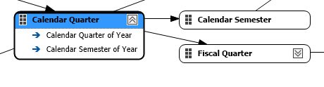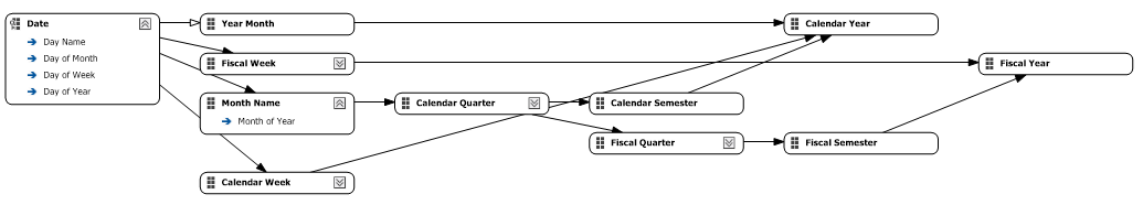 You can read the attribute relationships of the date dimension as follows: at the lowest level at the left we have the individual dates (which are the key attribute of the dimension). Dates roll up into months. Months roll up into quarters, quarters roll up into semesters and semesters finally roll up into years at the right.