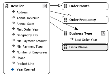 This is the default behavior: every attribute is related to the key attribute (Reseller in this example). There are two kinds of relationships: flexible and rigid. Flexible relationships can change over time. For example, a reseller might change banks. Rigid relationships are fixed; they cannot change. Here, the relationship Reseller – Business Type is rigid (as indicated by the black arrow). This means that the business type will never change for a reseller. If it does, the processing of the dimension will fail if you use Process Update.