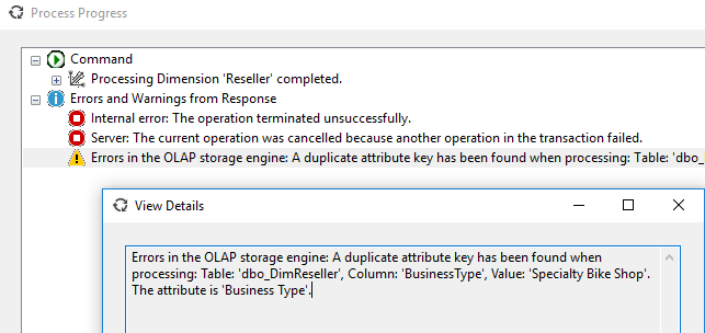 Keep in mind SSAS won’t stop you from creating attribute relationships that aren’t supported by the underlying data. When processing the dimension however, you will be confronted with several error messages. Let’s illustrate with an example. Suppose we created the following attribute relationship between business type and Last Order Year in the Reseller dimension.