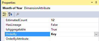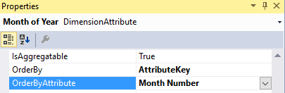 Now we can change the OrderBy property of Month of Year to AttributeKey. The OrderByAttribute should be set to Month Number.