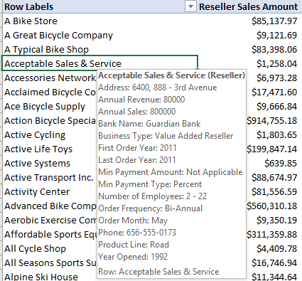 Notice the member property is not visible in the pivot table fields and there are no subtotals. Reporting Services also supports the use of member properties, but Power BI Desktop (currently) does not.