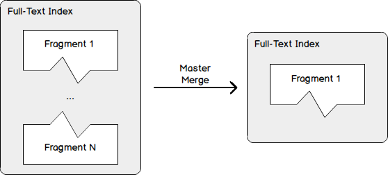 According to Microsoft’s documentation about the ALTER FULLTEXT CATALOG statement, the REORGANIZE option should be used as regular maintenance task as it will merge all the fragments created over time for an each Full-Text index to a single “container” (but it’s also a fragment). This operation is called a master merge. It’s represented in the figure below: