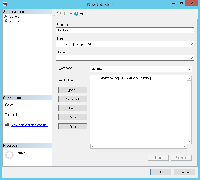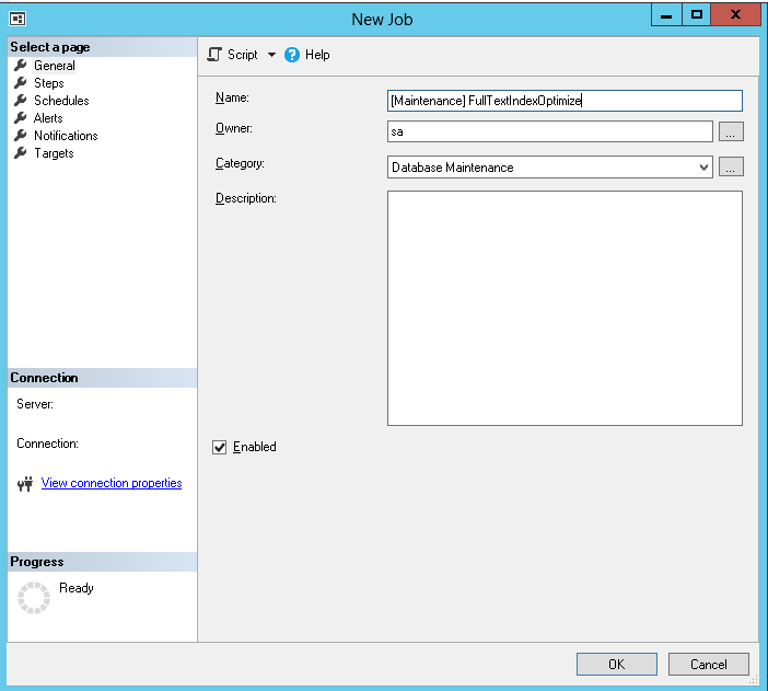 Now we have a stored procedure that can be run for maintaining our Full-Text indexes for all our databases, it’s time to schedule it. And what’s best suited for that than the famous SQL Server Agent… Here are the steps you can follow to generate a SQL Server Agent Job called “[Maintenance] FullTextIndexOptimize”: