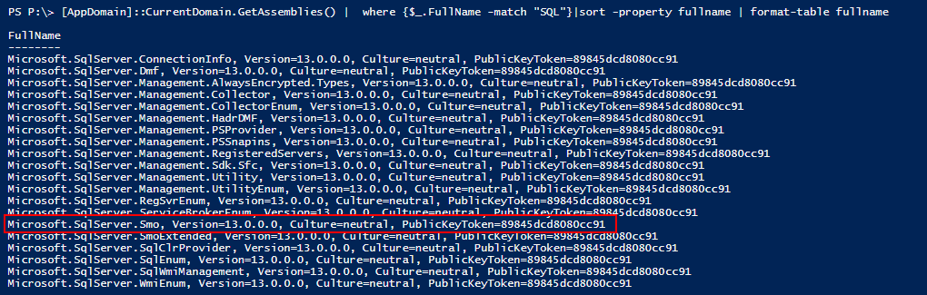 PS P:\> [AppDomain]::CurrentDomain.GetAssemblies() | where {$_.FullName -match "SQL"}|sort -property fullname | format-table fullname |