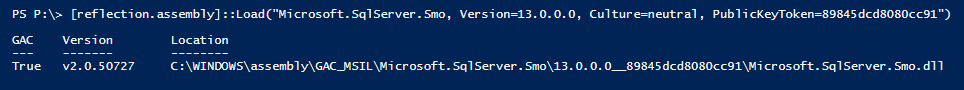 PS P:\>[reflection.assembly]::Load("Microsoft.SqlServer.Smo, Version=13.0.0.0, Culture=neutral,PublicKeyToken=89845dcd8080cc91") |