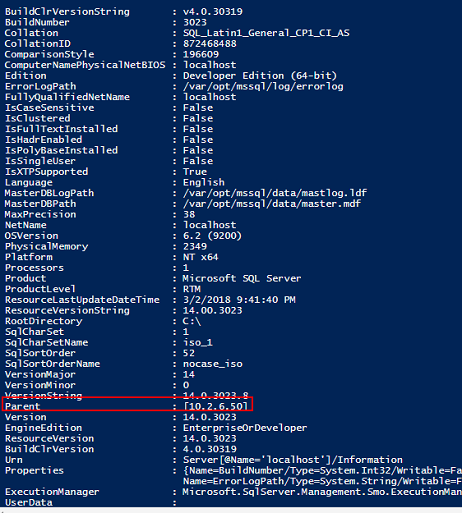 # The Linux SQL instance IP address # Prompt for credentials to login into SQL Server $serverInstance = "10.2.6.62" $credential = Get-Credential # Load the SMO assembly and create a Server object [System.Reflection.Assembly]::LoadWithPartialName('Microsoft.SqlServer.SMO') | out-null $server = New-Object ('Microsoft.SqlServer.Management.Smo.Server') $serverInstance # Set credentials $server.ConnectionContext.LoginSecure=$false $server.ConnectionContext.set_Login($credential.UserName) $server.ConnectionContext.set_SecurePassword($credential.Password) # Connect to the Server and get a few properties $server.Information |