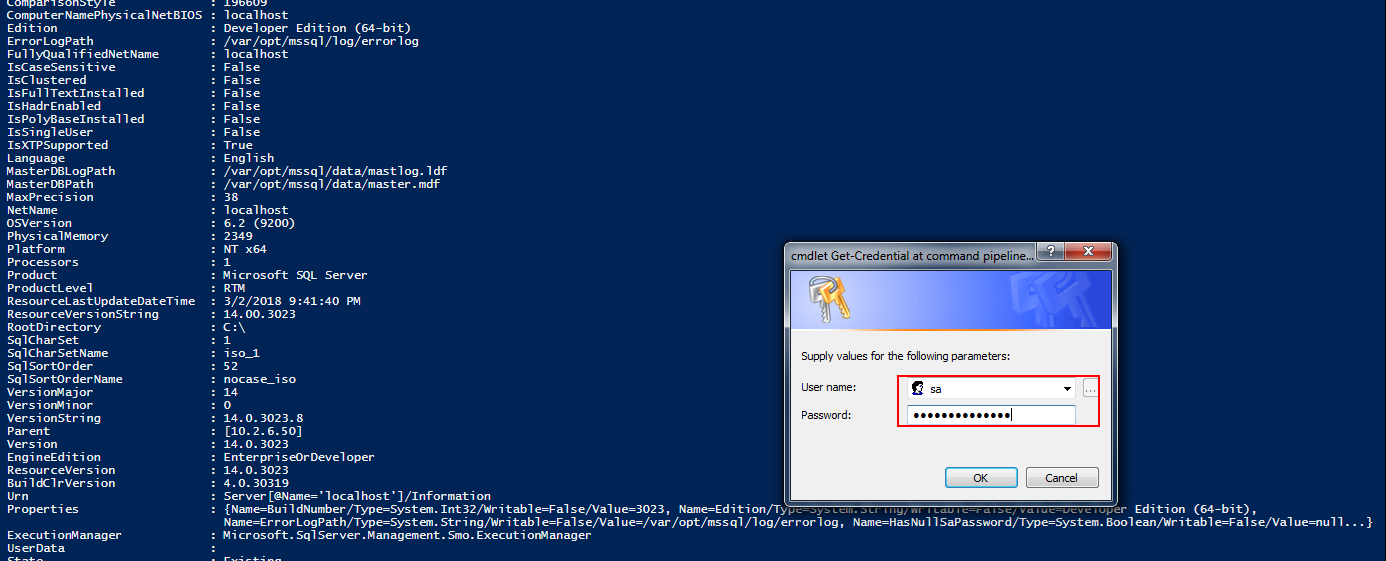 # The Linux SQL instance IP address $serverInstance = "10.2.6.50" $User = 'SA' # Convert plain text into a secure string $Pass = ConvertTo-SecureString 'thanVitha@2015' -AsPlainText –Force #supply the $Pass variable as SecureString for the password $Credentials = New-Object -TypeName System.Management.Automation.PSCredential -ArgumentList $User,$Pass #Build the connection $server = New-Object ('Microsoft.SqlServer.Management.Smo.Server') $serverInstance # Set credentials $server.ConnectionContext.LoginSecure=$false $server.ConnectionContext.set_Login($Credentials.UserName) $server.ConnectionContext.set_SecurePassword($credentials.Password) # Connect to the Server and get a few properties $server.Information |