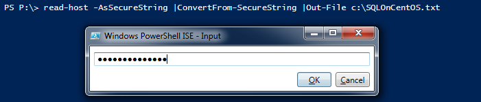 PS P:\> read-host -AsSecureString |ConvertFrom-SecureString |Out-File c:\SQLOnCentOS.txt |