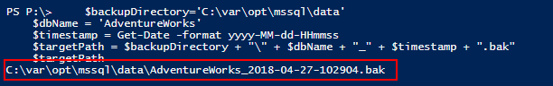 $backupDirectory='C:\var\opt\mssql\data' $dbName = 'AdventureWorks' $timestamp = Get-Date -format yyyy-MM-dd-HHmmss $targetPath = $backupDirectory + "\" + $dbName + "_" + $timestamp + ".bak" |