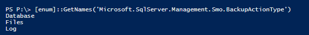 PS P:\> [enum]::GetNames('Microsoft.SqlServer.Management.Smo.BackupActionType') |