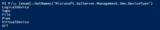 PS P:\> [enum]::GetNames('Microsoft.SqlServer.Management.Smo.DeviceType') |