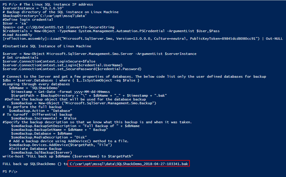 # The Linux SQL instance IP address $serverInstance = "10.2.6.50" # Backup directory of the SQL instance on Linux Machine $backupDirectory='C:\var\opt\mssql\data' #Define login credential $User = 'sa' $pass= cat c:\SQLOnCentOS.txt |ConvertTo-SecureString $Credentials = New-Object -TypeName System.Management.Automation.PSCredential -ArgumentList $User,$Pass #Load Assembly [reflection.assembly]::Load("Microsoft.SqlServer.Smo, Version=13.0.0.0, Culture=neutral, PublicKeyToken=89845dcd8080cc91") | Out-NULL #Instantiate SQL Instance of Linux Machine $server = New-Object Microsoft.SqlServer.Management.Smo.Server -ArgumentList $serverInstance # Set credentials $server.ConnectionContext.LoginSecure=$false $server.ConnectionContext.set_Login($credential.UserName) $server.ConnectionContext.set_SecurePassword($credential.Password) # Connect to the Server and get a few properties of databases. The below code list only the user defined databases for backup $dbs = $server.Databases | where { $_.IsSystemObject -eq $False } #Looping through every databases $dbName = 'SQLShackDemo' $timestamp = Get-Date -format yyyy-MM-dd-HHmmss $targetPath = $backupDirectory + "\" + $dbName + "_" + $timestamp + ".bak" #Define the backup object that will be used for the database backup $smoBackup = New-Object ("Microsoft.SqlServer.Management.Smo.Backup") # To perform the full backup $smoBackup.Action = "Database" # To turnoff Differential backup $smoBackup.Incremental = $False #Specify the backup description so that we know what this backup is and when it was taken. $smoBackup.BackupSetDescription = "Full Backup of " + $dbName $smoBackup.BackupSetName = $dbName + " Backup" $smoBackup.Database = $dbName $smoBackup.MediaDescription = "Disk" # Add a backup device using AddDevice() method to a file. $smoBackup.Devices.AddDevice($targetPath, "File") #Initiate Database Backup $smoBackup.SqlBackup($server) write-host "FULL back up $dbName ($serverName) to $targetPath" |