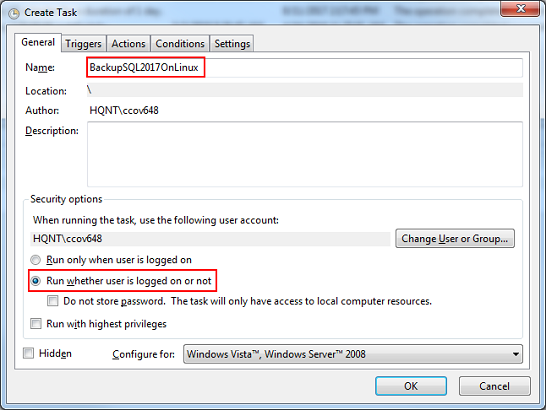 - Pick a name for the task, and choose “Run whether user is logged on or not”