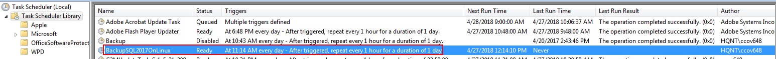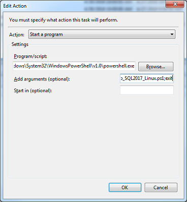 As per the screenshot, I saved the file under C:\BackupJob_SQL2017_Linux.PS1. Therefore, in the add arguments text box, I entered: C:\ BackupJob_SQL2017_Linux.PS1;exit