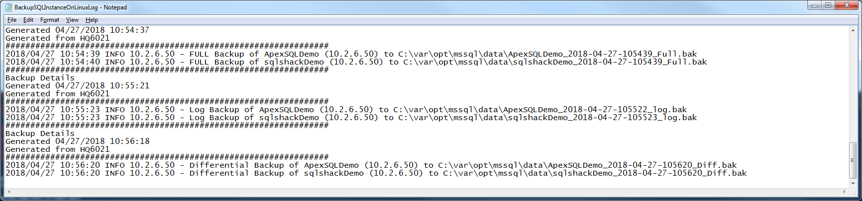 Get-SQLinuxBackup -SQLServerInstance "10.2.6.50" -logfile "C:\Backup\BackupSQLInstanceOnLinuxLog.txt" |