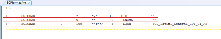 Now, modify the format file, the first data field maps to EID, skips ENAME, and the third row maps the second data field of the data file to EJOB. The loading should ignore the ENAME column.