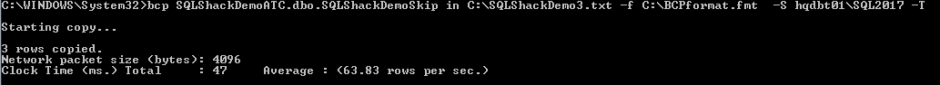 C:\WINDOWS\System32>BCP SQLShackDemoATC.dbo.SQLShackDemoSkip in C:\SQLShackDemo3.txt -f C:\BCPformat.fmt -S hqdbt01\SQL2017 –T |