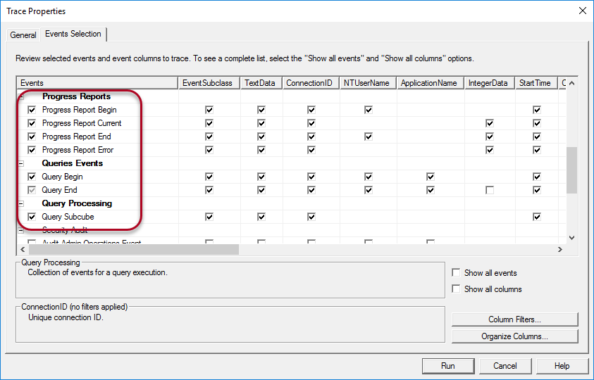 In the Events Selection tab, only keep the events from the sections Progress Reports, Queries Events and Query Subcube selected.