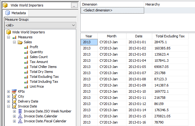 Let’s drag in the Calendar Hierarchy and the Total Excluding Tax measure.