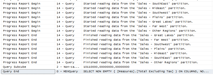 One of the most important benefits however is not related to processing time, but to query performance. When you have defined partitioning and your MDX query only select data from a certain partition, all the other partitions won’t be read. This can significantly reduce your query response time. This is called partition elimination. Let’s look at an example.