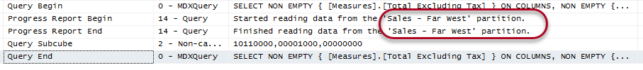 When we look at the Profiler trace, we can now see only one single partition was read: