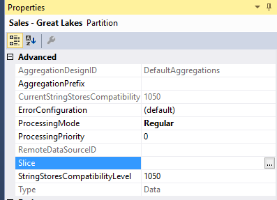 Now SSAS knows the partition only includes data for this particular Sales Territory. For MOLAP storage, SSAS automatically detects which data is loaded into a partition and it will set the slice accordingly (internally, you won’t see a change in the slice property). However, this is not 100% waterproof. For optimal configuration, it’s recommended to set the slices manually.
