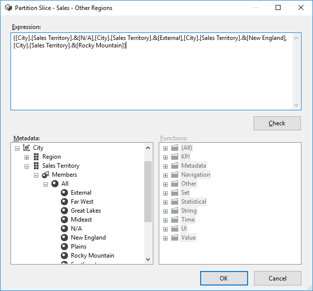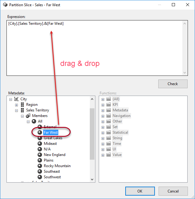You can set this property manually. For the Far West partition, this would be [City].[Sales Territory].&[Far West]. You can drag and drop the appropriate member to the expression editor: