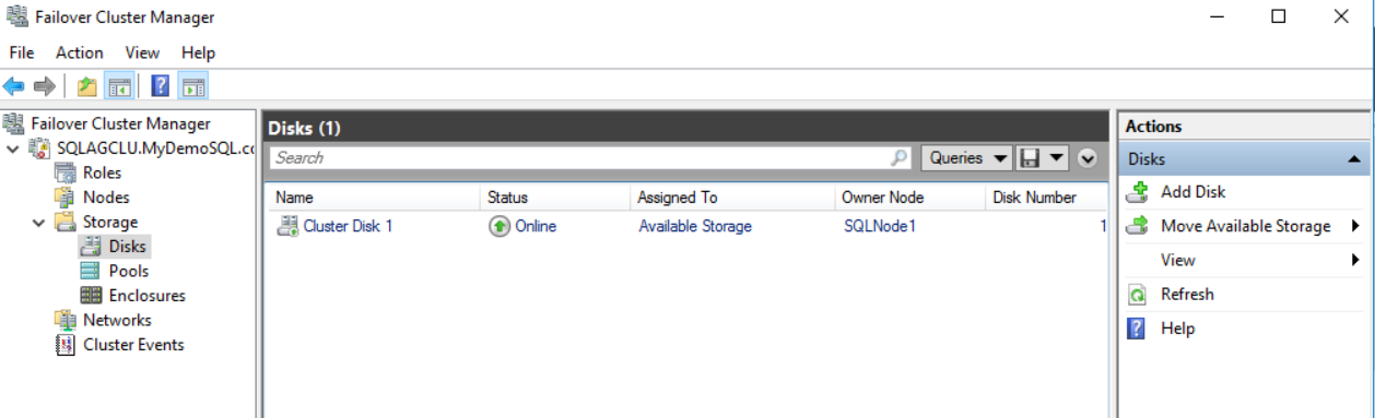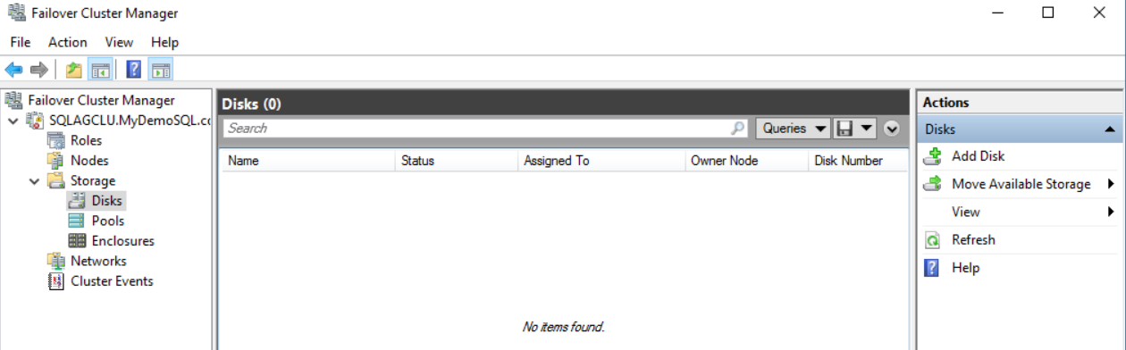 To add this disk as a cluster resource, open the failover cluster manager and click on Storage -> Disks. Currently, It does not show any clustered disk in the console.