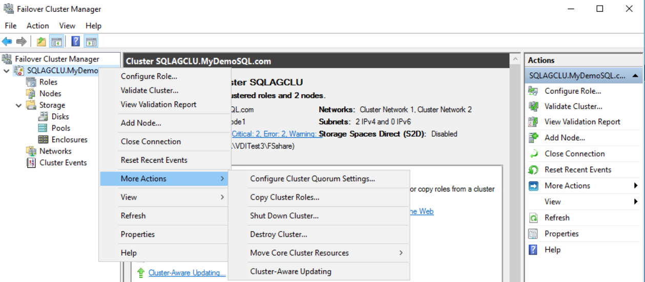 Now, right-click on the Cluster name and go to More Actions -> Configure Cluster Quorum Settings.