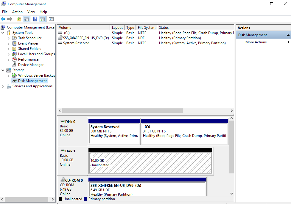 In the below screenshot, we see a root drive along with a 10 GB unallocated space. It is the same virtual disk of 10 GB that we configured earlier.