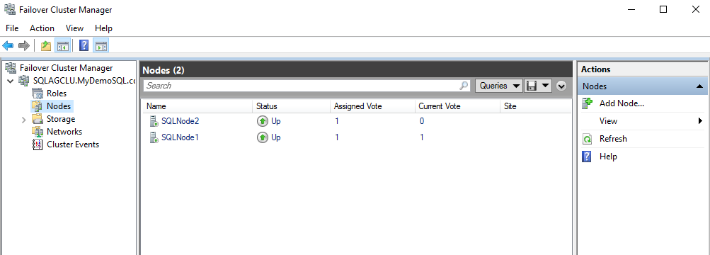 Once the process is finished, launch the Failover cluster manager and view the nodes. It should show both nodes in the Up status.