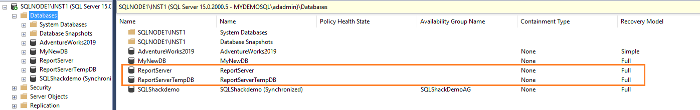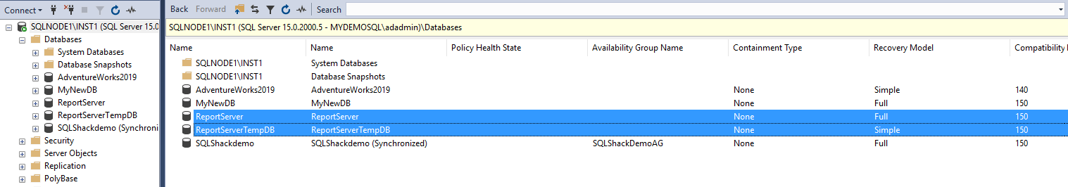 It creates the [ReportServer] and [ReportServerTempDB] database on the SQLNode1\INST1. As of now, these databases are not part of any SQL Server Always On Availability Groups.