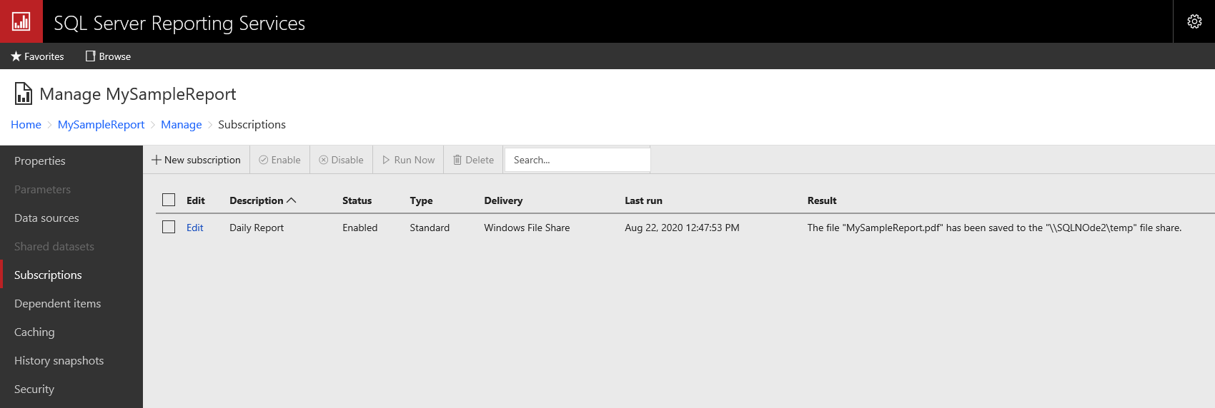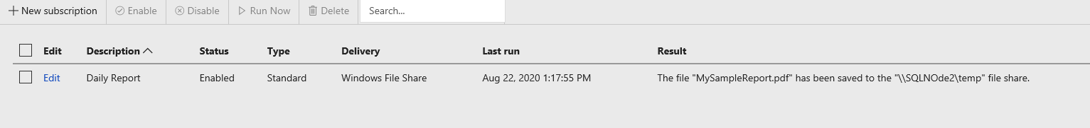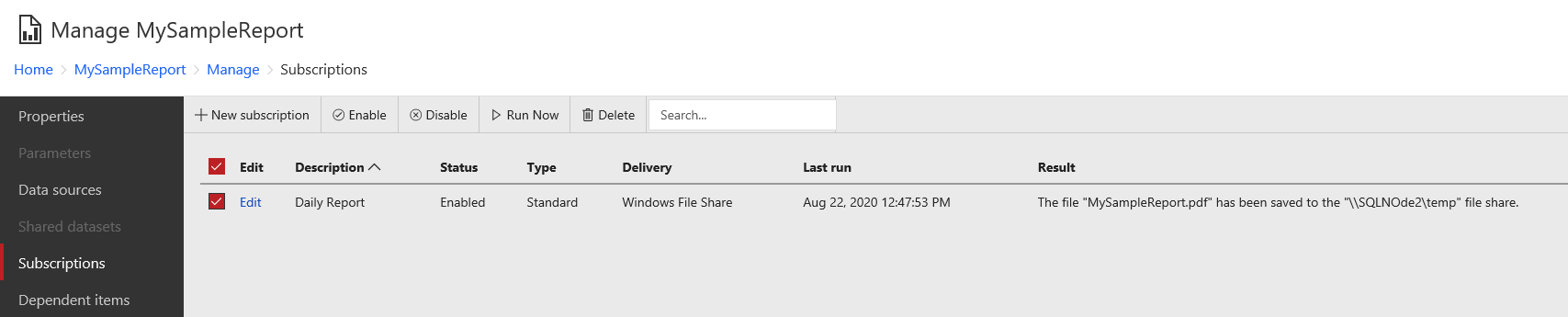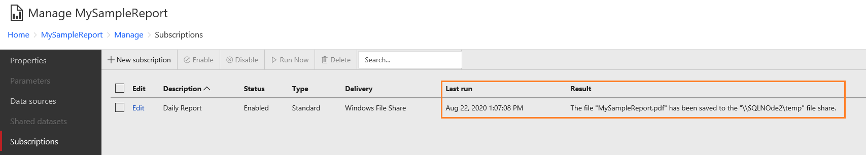 The third validation is for the report server subscription. Select the report subscription and run it manually.