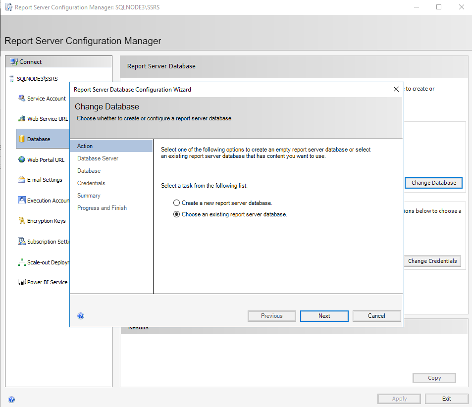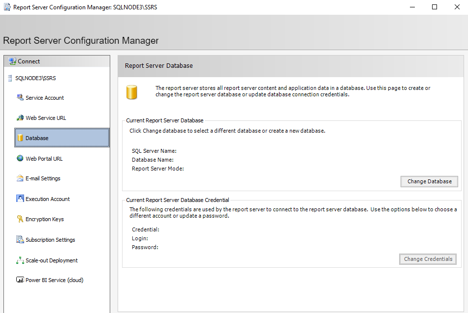 Click on Change Database. We do not have any existing database so choose “Create a new report server database”