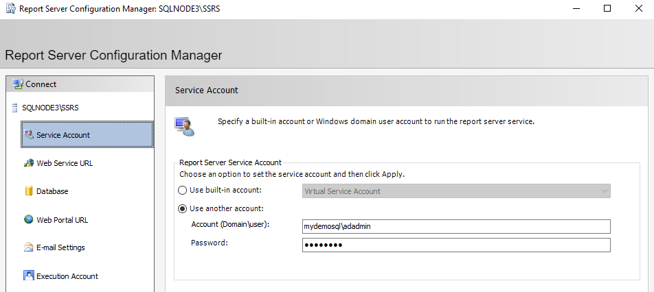 Service account configuration: In the service account page, specify a domain account to run the reporting service. It automatically restarts the reporting services once you apply the service accounts