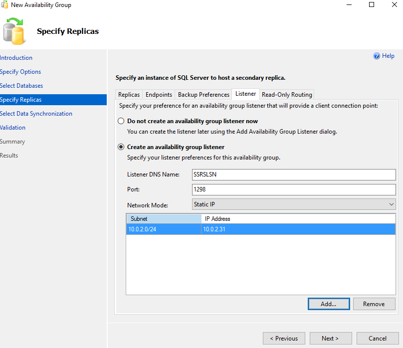 Specify listener name and IP address for this SQL Server Always On Availability Group. SQL listener is a must for the reporting services database in AG configuration.