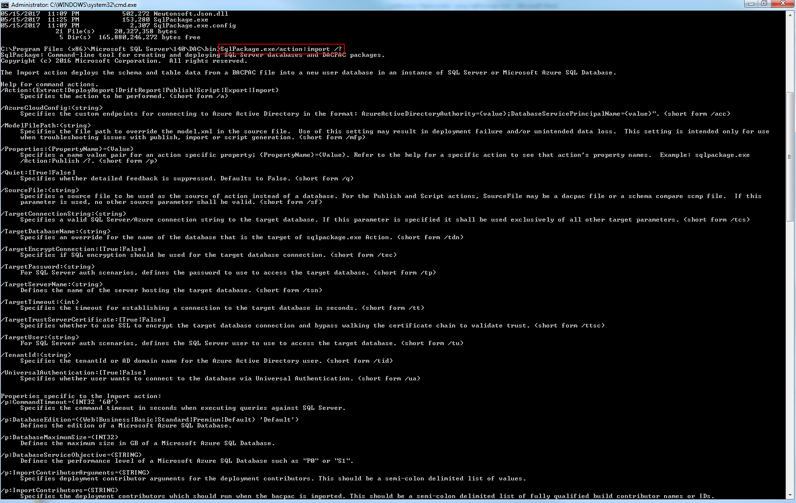 sqlpackage.exe /action:Import /? sqlpackage.exe /action:Extract /? sqlpackage.exe /action:DeployReport /? |