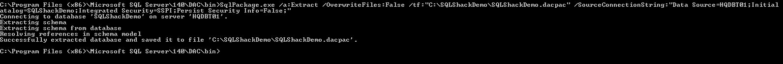 C:\Program Files (x86)\Microsoft SQL Server\140\DAC\bin>SqlPackage.exe /a:Extract /OverwriteFiles:False /tf:"C:\SQLShackDemo\SQLShackDemo.dacpac" /SourceConnectionString:"Data Source=HQDBT01;Initial Catalog=SQLShackDemo;Integrated Security=SSPI;Persist Security Info=False;" |
