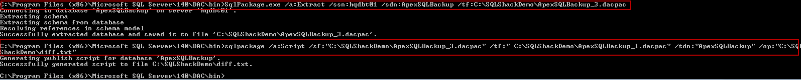 C:\Program Files (x86)\Microsoft SQL Server\140\DAC\bin>sqlpackage /a:Script /sf:"C:\SQLShackDemo\ApexSQLBackup_3.dacpac" /tf:" C:\SQLShackDemo\ApexSQLBackup_1.dacpac" /tdn:"ApexSQLBackup" /op:"C:\SQLShackDemo\diff.txt" |