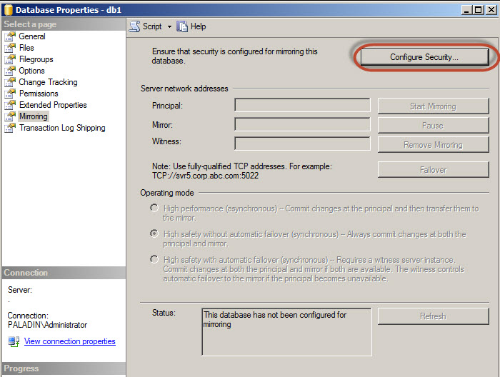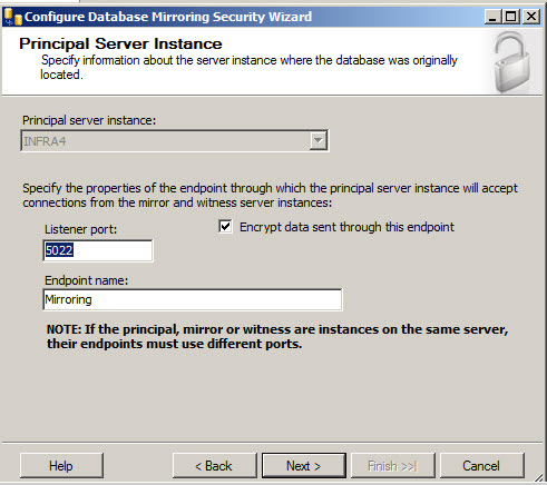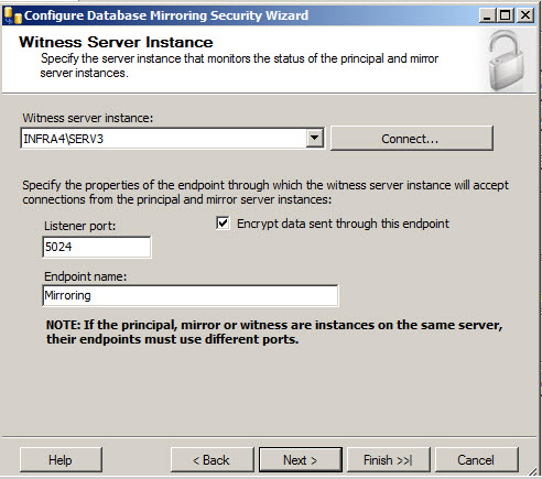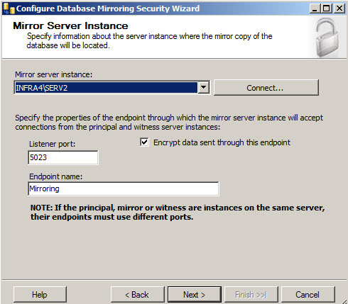 Figure 5. Select Server to configure.In the next option, you will select the ports used. We also have an option to Encrypt the data send from one Server to Another. The Principal Server and the Mirroring Server will be synchronizing data constantly. The Endpoint name will be created here. If you are using the same server with different instances, a different port should be used for each server.