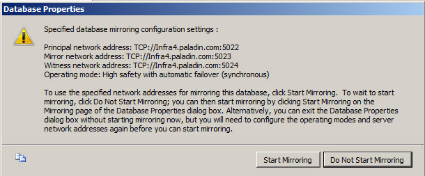 Figure 12. The Start Mirroring message.Once you are done, the rest is easy. You can simulate that your Service is down (by stopping the SQL Server Database Engine Service in the Principal Server).
