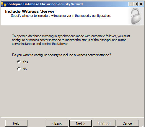 Figure 3. The Database Mirroring WizardThe first wizard will ask if you want a Witness. If you want the manual failover or a high-performance mirroring, the Witness is not necessary. If you want a high availability mirroring with automatic failover, select the yes option. In this demo, we will use a Witness.