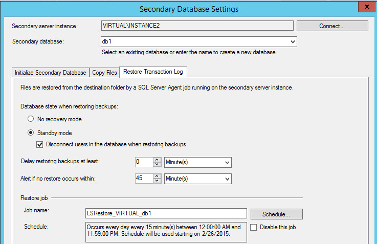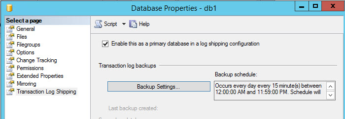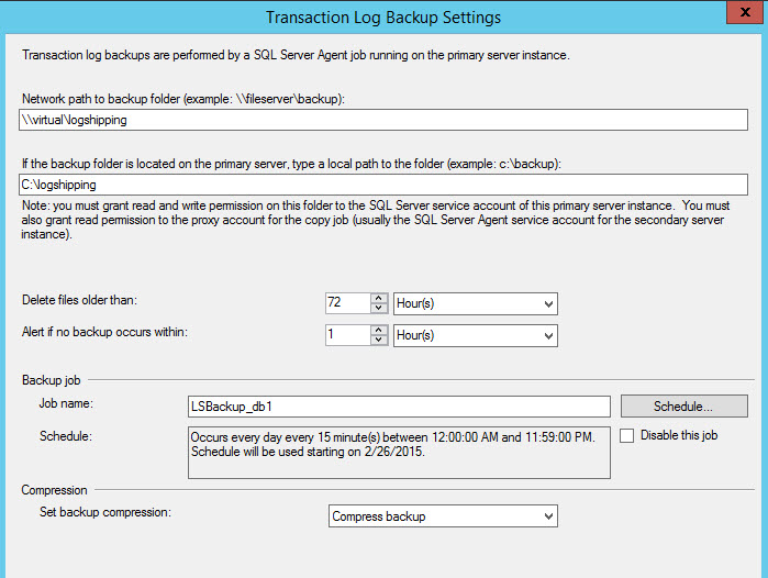 Specify the network path and the local path in the primary server of the folder where the Transaction log backups will be stored. You can rise an alert if the backup does not occur and delete older files within a determined time. The Job name is LSBackup_db (Log Shipping Backup). With the Schedule button you can Schedule de backup every to the time of your preference. By default, it is scheduled every 15 minutes. You can also Disable the job with this Window or compress the backup.