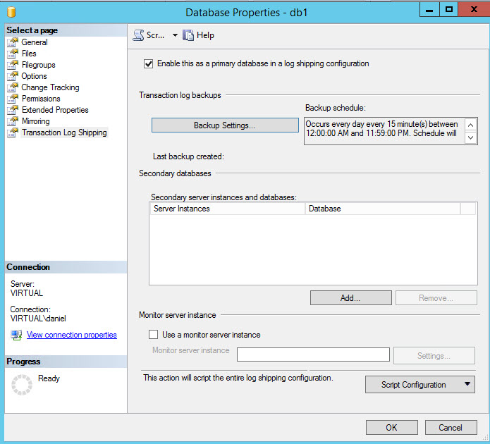 In my last article, I show how to create Database Mirroring for high availability. This time, I will work on Log Shipping.