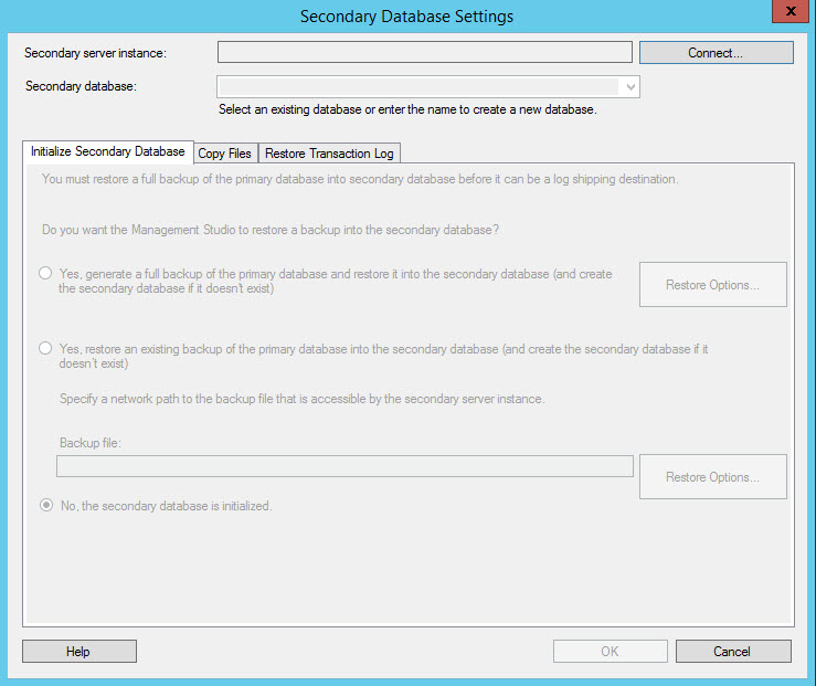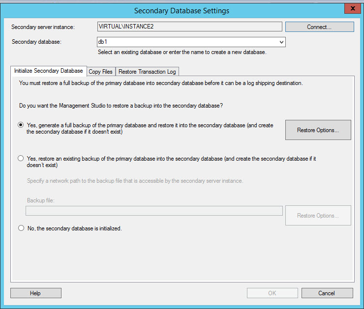 In the Initialize Secondary Database Tab, if you do not have a backup already created on the secondary machine from the primary machine, select the option yes to generate a full backup. If you already have a backup, select the option Yes, restore an existing backup. With the Restore Options, you can select the restore configurations. If you have an already restored database on the secondary server, select the No, the secondary database is initialized. In this example, the first option will be used.