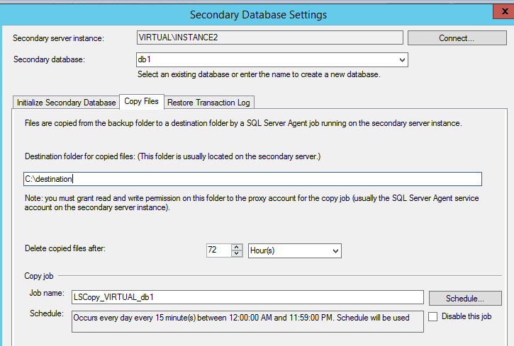 In the Copy Files tab, select the destination folder. In the destination folder, you will have the Transaction log backups created and copied from the primary server. You can delete copied files after a specified time. The folder was created in the requirements of this document. You can delete files copied after a specified period and schedule the copies according to your preferences. The job created will be LSCopy_MachineName_DatabaseName. By default, the copy is programmed every 15 minutes.
