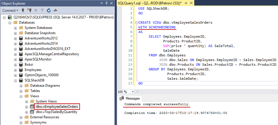 Let’s move on and create an index on our view. Consider the script from below for creating a clustered index on the vEmployeeSalesOrders view: